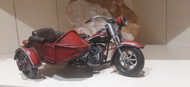 Detalles del productoRéplica detallada de una moto clásica Harley Davidson con sidecar, en un llamativo color rojo.