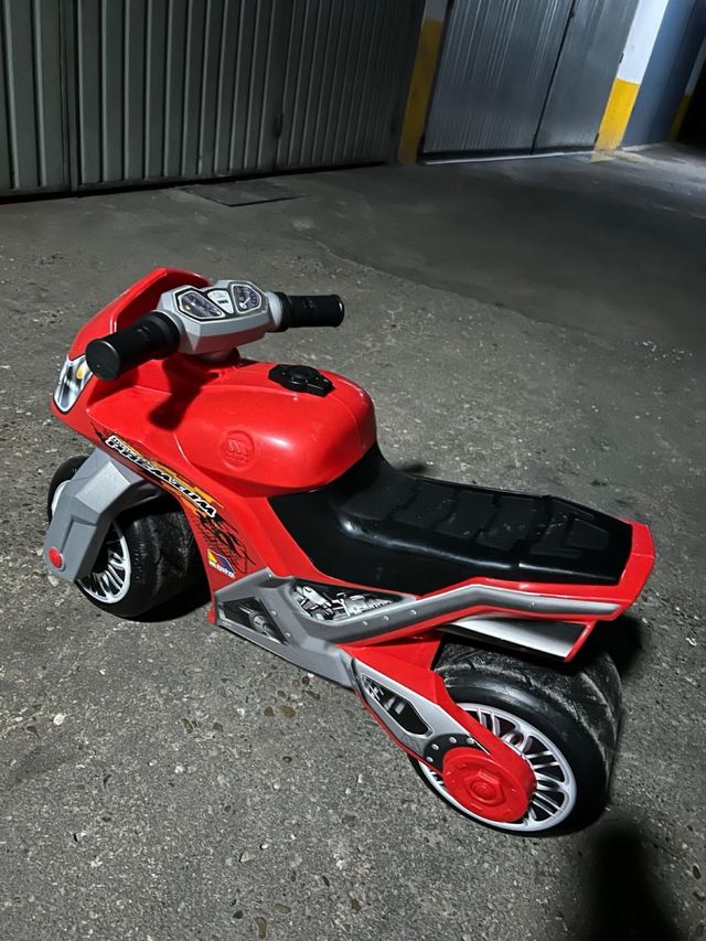 Detalles del productoMoto de juguete de color rojo, ideal para los más pequeños. Tiene un diseño deportivo y ruedas anchas para mayor estabilidad.