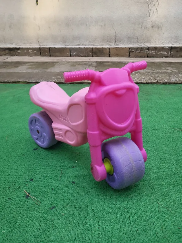 Moto de juguete para niños, de color rosa y morado. Ideal para que los más pequeños se diviertan. - Diseño de moto. - Ruedas de plástico. - Manillar para dirigir.
