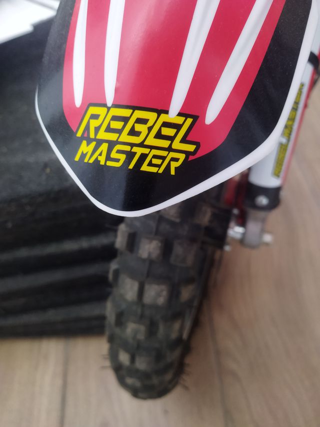 Moto de motocross para niños con diseño Rebel Master. - Diseño deportivo en rojo, blanco y negro. - Rueda delantera de tacos.