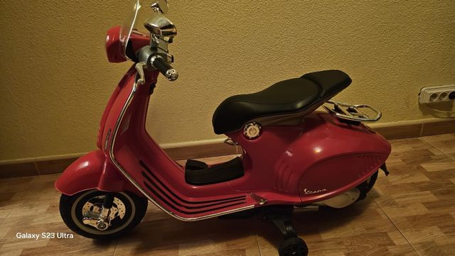 Moto Vespa para niños, color rojo brillante. PRECIO NEGOCIABLE - Diseño clásico. - Ruedines de apoyo. - Asiento cómodo.