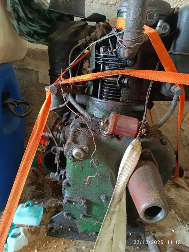 Detalles del productoMotor de combustión interna, de aspecto robusto y con detalles de pintura verde y negra. Se aprecian correas de sujeción naranjas y una tela blanca.