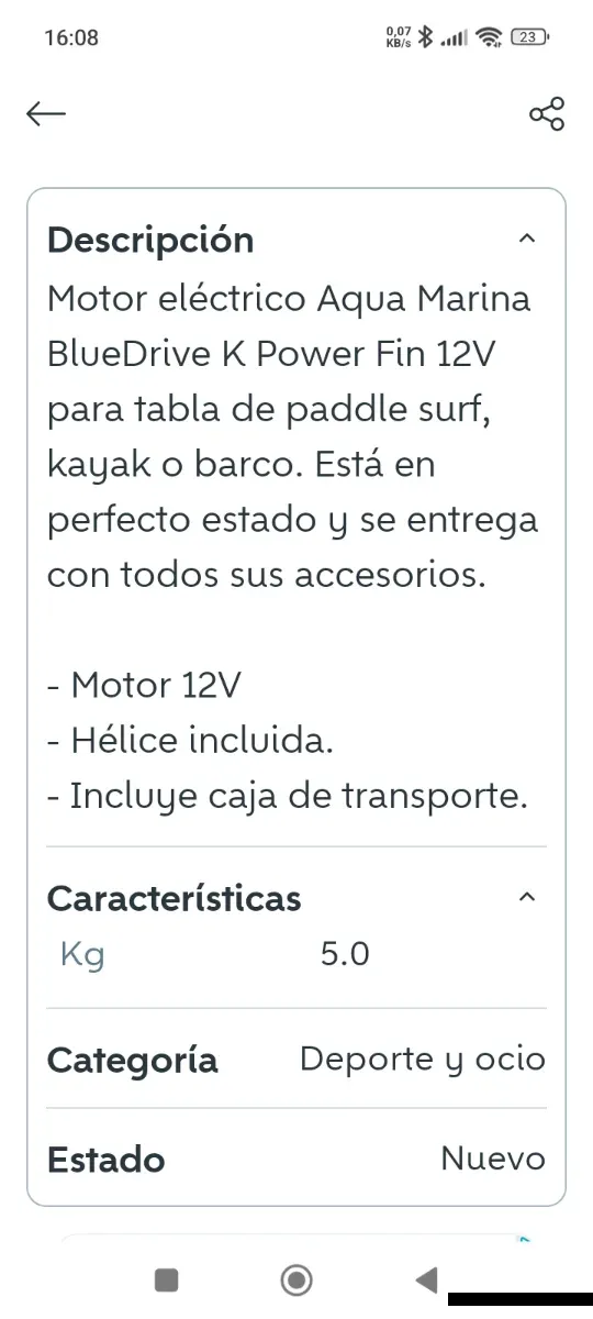 Detalles del productoMotor eléctrico Aqua Marina BlueDrive K Power Fin 12V para tabla de paddle surf, kayak o barco. Está en perfecto estado y se entrega con todos sus accesorios.