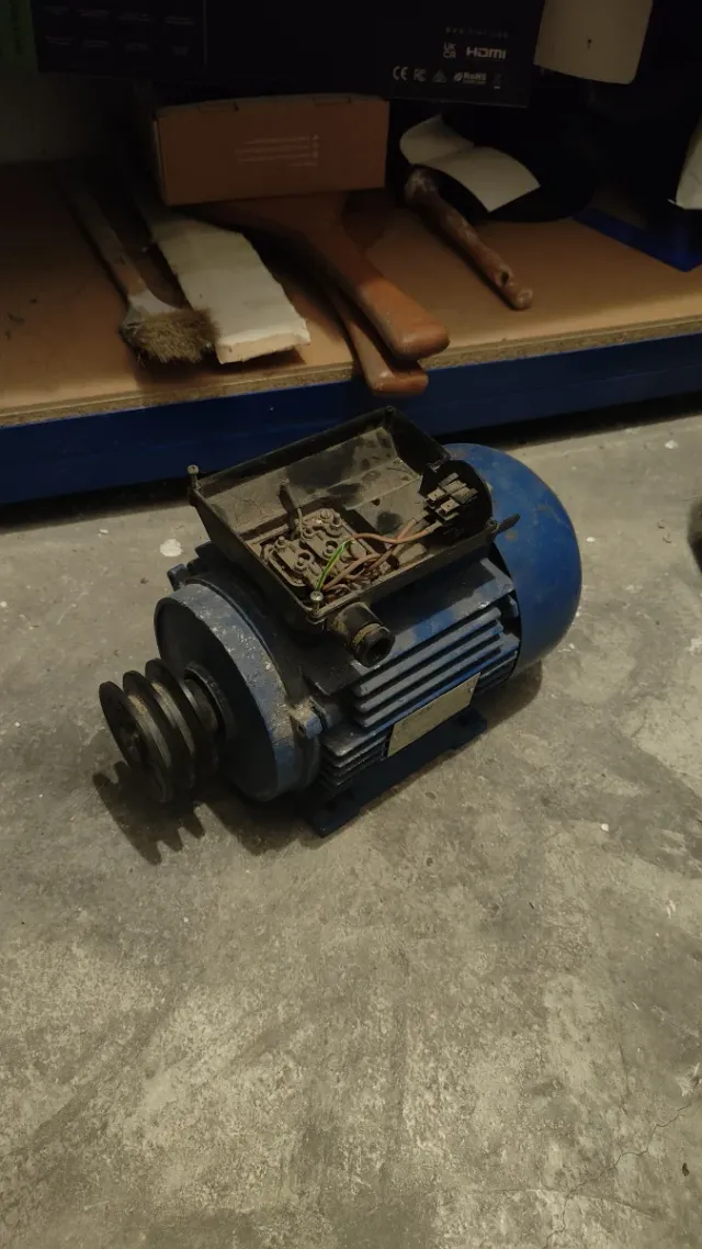 Motor eléctrico de color azul, ideal para talleres. Cuenta con polea. - Carcasa metálica. - Conexiones eléctricas expuestas.