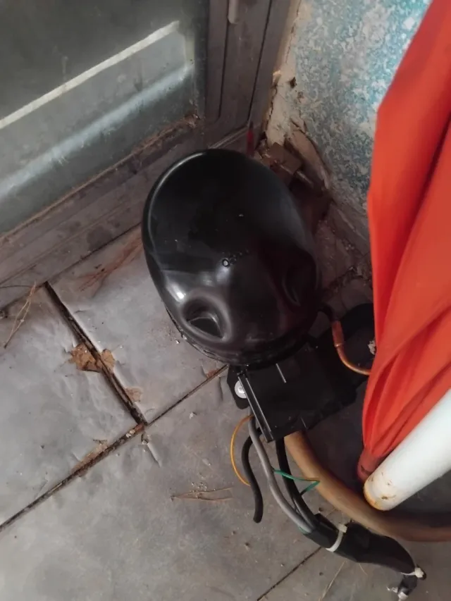Motor de nevera en color negro. - Componente de refrigeración. - Conexiones eléctricas visibles.