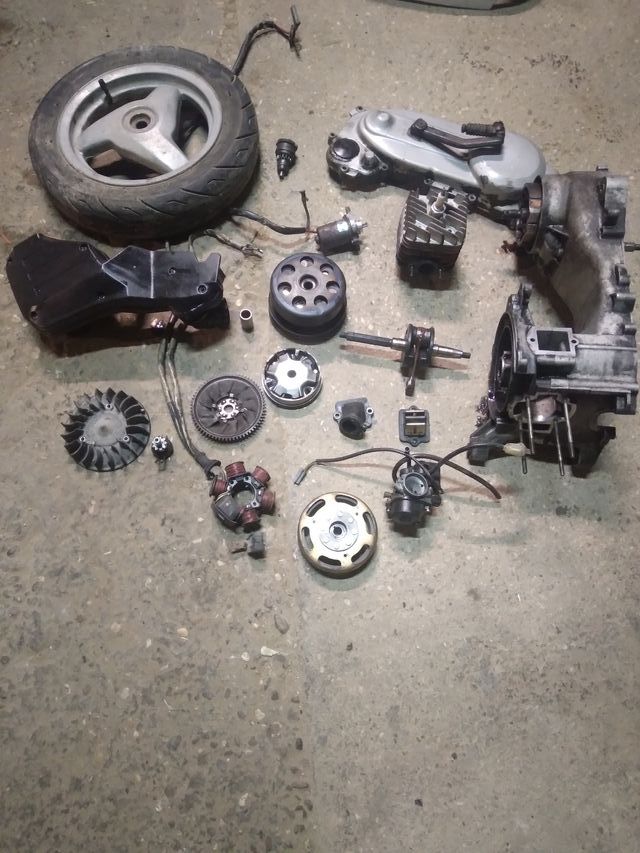 Despiece de motor de piaggio zip. Carteres, cigueñal, cilindro y piston, variador, embrague, tapa de arranque, caja de filtro de aire, carburador, rueda trasera...