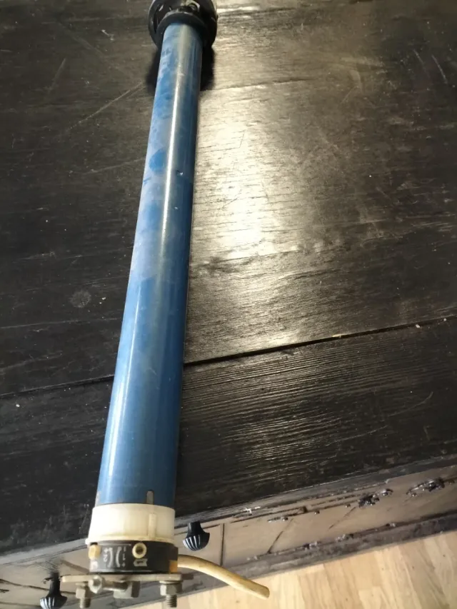 Motor eléctrico de color azul, diseñado para toldos o persianas. Se encuentra en buen estado. - Tubo de color azul. - Componentes de sujeción y control visibles.