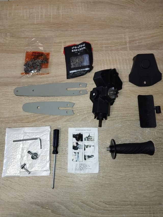 Detalles del productoMini motosierra adaptada para taladro con dos placas de sierra de 4 y 6 pulgadas Medidas del producto