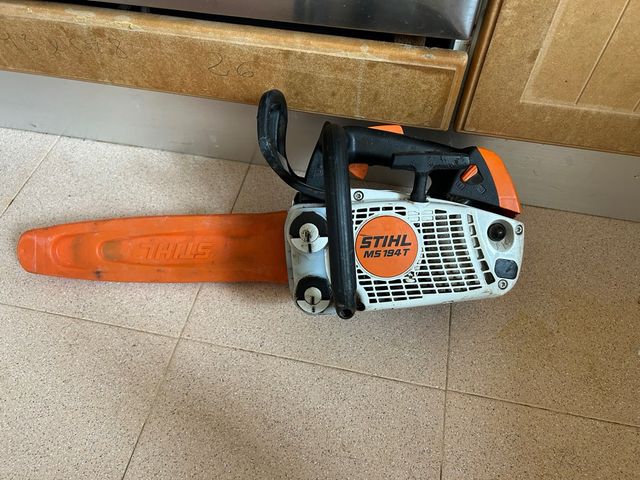 Motosierra Stihl MS 194 T en buen estado. - Color blanco y naranja. - Incluye funda protectora naranja con logo Stihl.