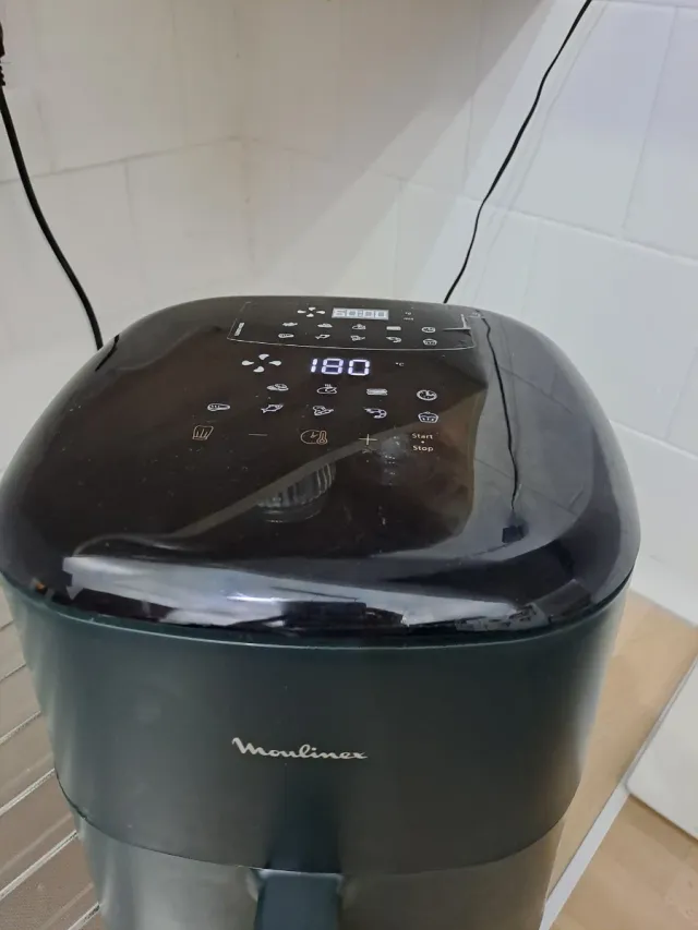 Detalles del productoFreidora de aire Moulinex en color negro y verde oscuro. Cuenta con pantalla digital y varios programas preestablecidos.Comprada en el Corte Inglés hace 2 meses por 96 euros,se vende por no usarse.