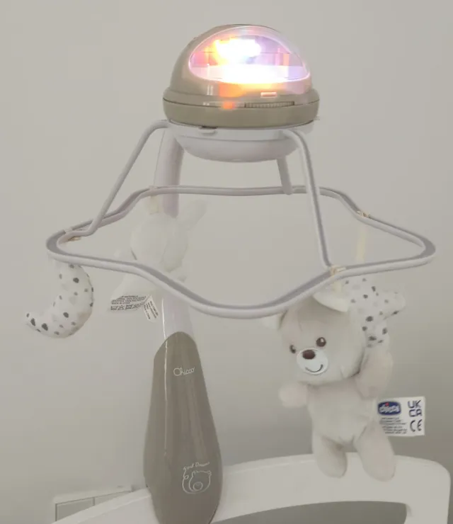 Detalles del productoMóvil para cuna de la marca Chicco, con proyector de luces y melodías.