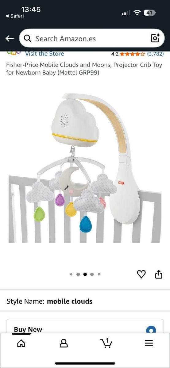 Móvil para cuna de la marca Fisher-Price, modelo Nubes y Lunas. - Proyector de luz. - Incluye figuras de nubes y lunas. - Diseñado para bebés recién nacidos.