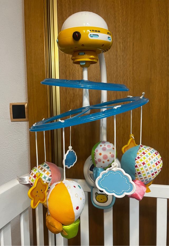 Móvil de cuna con proyector de estrellas y figuras. - Proyector de luz nocturna. - Incluye figuras de nubes, estrellas y globos. - Diseño colorido y atractivo.