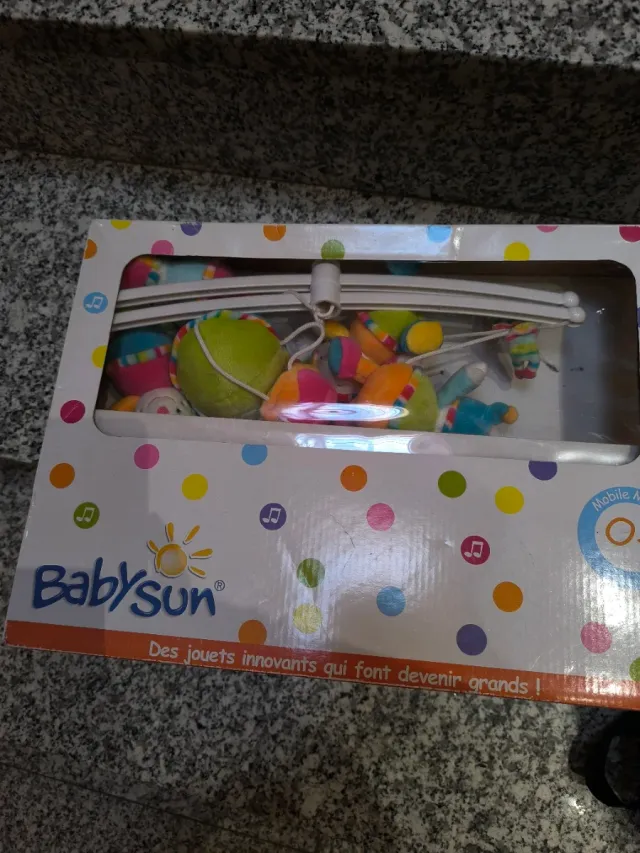 Móvil musical de la marca BabySun para la cuna. Los juguetes cuelgan de una barra. - Diseño colorido con figuras. - Incluye melodía.