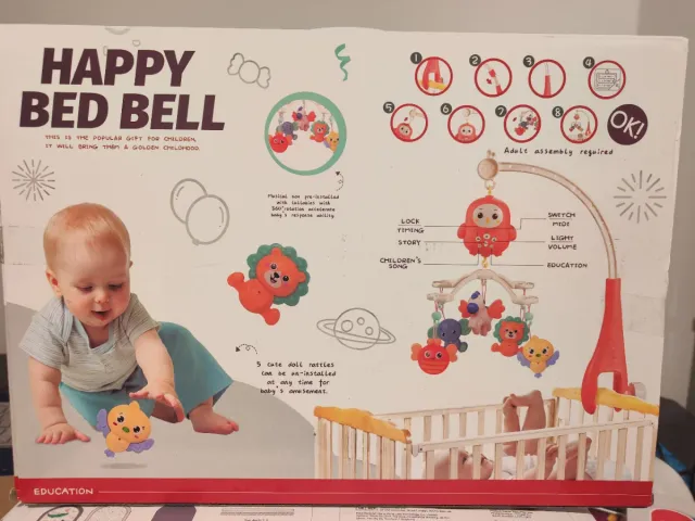Detalles del productoMóvil musical para cuna Happy Bed Bell con sonajeros.