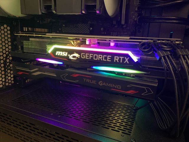 Detalles del productoTarjeta gráfica MSI GeForce RTX 2080 SUPER X TRIO con iluminación RGB.