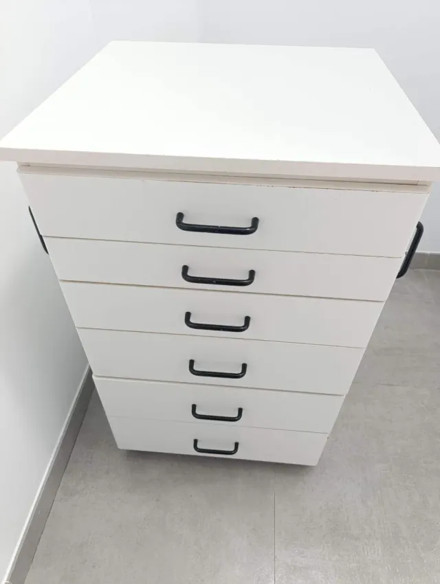 Detalles del productoCajonera con ruedas, especial para clínicas y consultorios. Diseño funcional y fácil de mover. Color blanco. Cuenta con seis cajones plásticos de diferentes tamaños y de fácil limpieza gracias a sus bordes redondeados. En buen estado. Funciona correctamente.