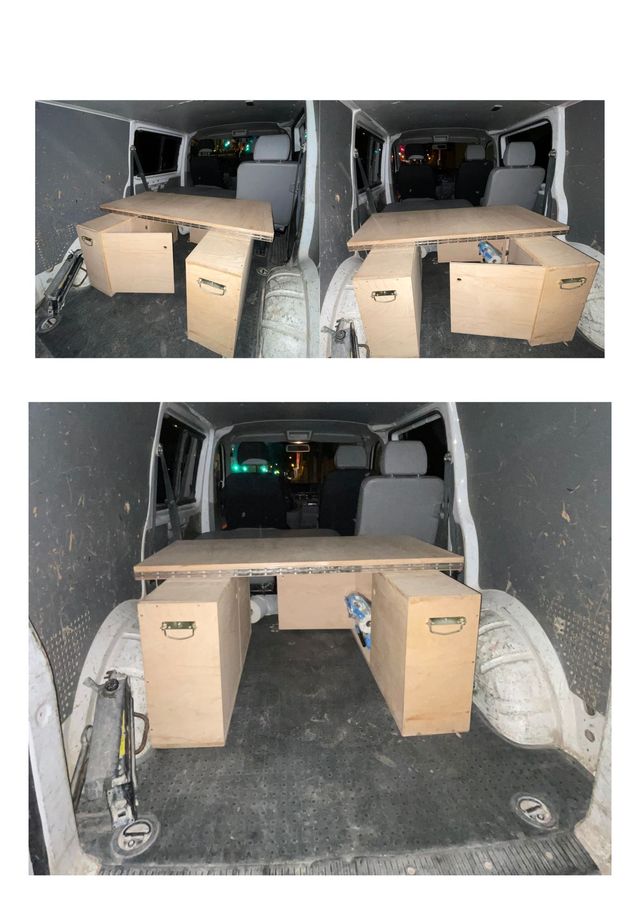 Ideal para cualquier furgoneta grande. La estructura deja un espacio en medio para poder usarlo para maletas/bolsas/mascota/... Las cajoneras tienen pestillos para poder anclarse bien al somier, así como asas para transportarlas sin mucho esfuerzo.