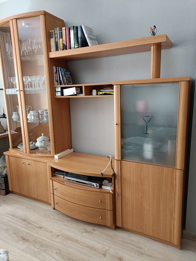 Detalles del productose vende mueble de comedor con luz en la vitrina y en el bar, módulo debajo de la vitrina con dos puertas y módulo debajo de la televisión con dos cajones grandes. Medidas del producto