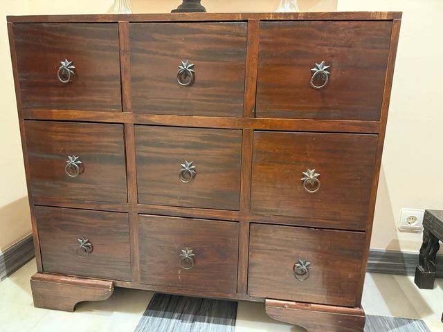 Mueble con 9 cajones madera marrón.