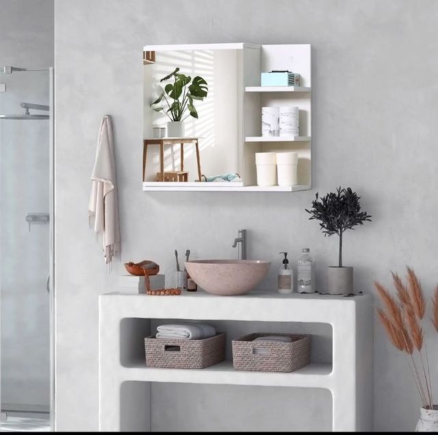 kleankin Armario con Espejo para Baño con 3 Estantes Abiertos y 1 Estante Interior Estilo Moderno 60x18x50 cm Blanco 834-378wt q2