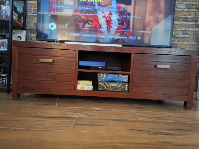 Detalles del productoMueble de TV de madera oscura, ideal para organizar tu espacio.