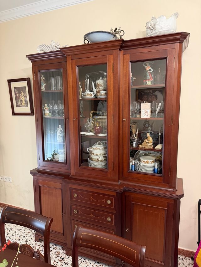 Detalles del productoMueble de salón de madera de caoba, con vitrinas y cajones.