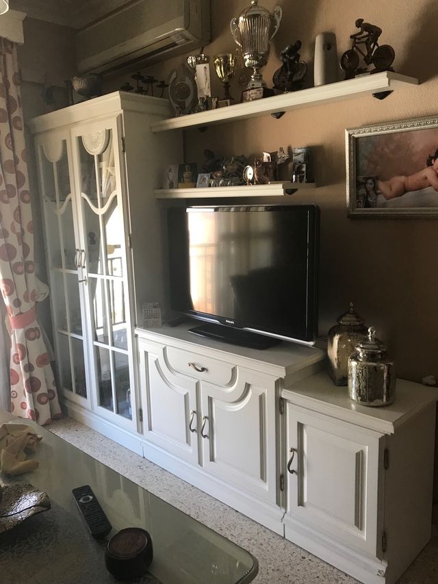 Mueble de salón de madera blanco tiene vitrina, mesa de televisión y otro muebles más y dos repisas