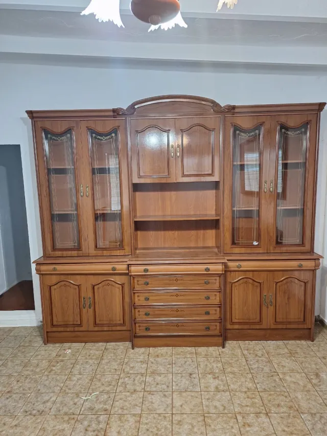 Mueble de salón de madera con vitrinas y cajones. - Diseño clásico y elegante. - Acabado en madera natural. - Amplio espacio de almacenamiento.