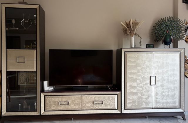 Compuesto por conjunto de mueble de TV con vitrina ( el conjunto está sin atornillar por lo que se puede cambiar la posición del conjunto) aparador y mesa extensible con 6 sillas tapizadas y mesa pequeña elevable para la zona del sofá, se vende por tener un bebé y un salón bastante pequeño para poder tenerlo todo.