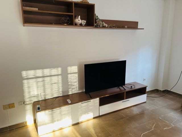 • Mueble bajo con varios compartimentos: puertas abatibles, cajones amplios y huecos abiertos para consola, router o deco.