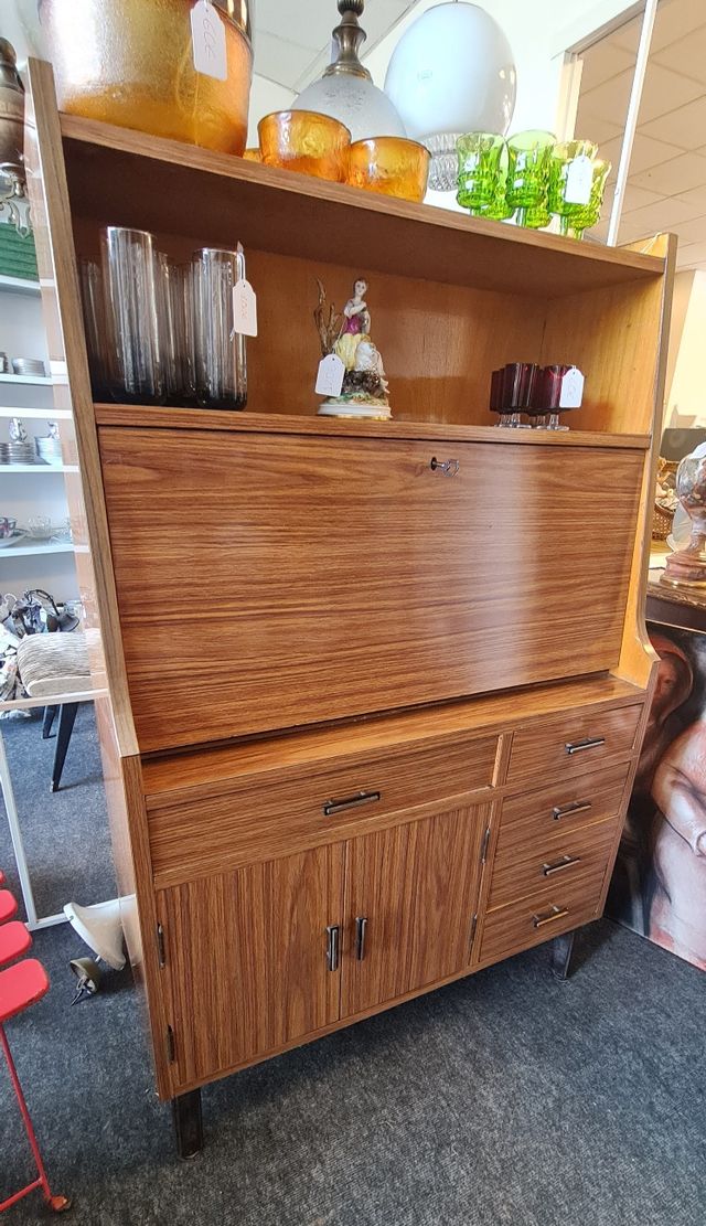 Mueble secreter en formica de los años 70s en color marrón veteado, secreter abatible con llave y debajo cajones a modo de cómoda.