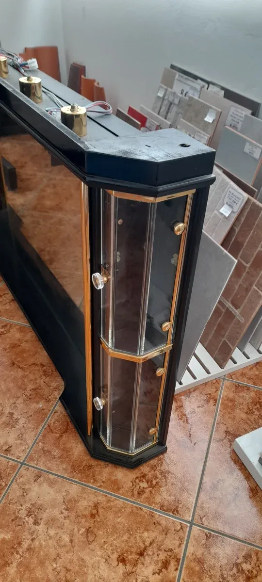 Mueble con detalles de espejo y diseño de rincón. - Acabado en negro con detalles dorados. - Puertas de cristal facetado. - Tiradores de cristal.