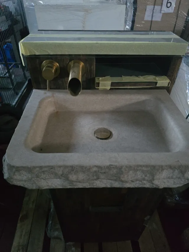 Mueble lavabo de piedra, madera y metal