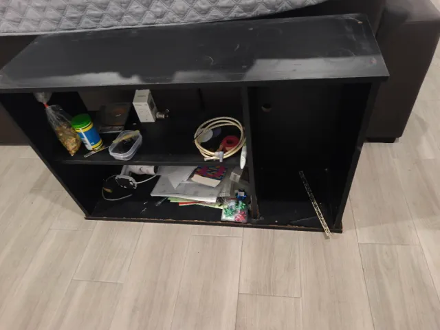Detalles del productoMueble negro para colocar un acuario o terrario. Sus dimensiones son 101 cm de largo, 31 cm de fondo y 64 cm de alto.