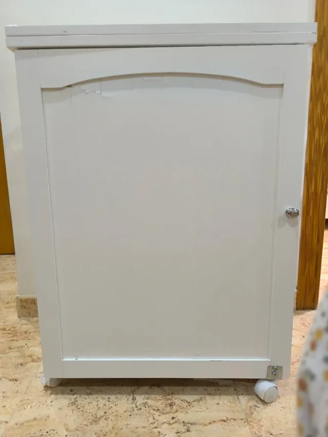 Detalles del productoMueble para máquina de coser blanco con ruedas.
