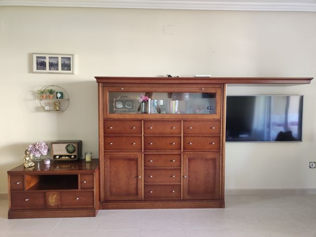 Detalles del productoConjunto de mueble de salón comedor en madera de cerezo. Incluye mueble bajo con cajones y hueco central, y mueble alto con vitrina y cajones. Se pueden adaptar como quieras, lo tengo así por los niños pequeños. Se puede poner mueble debajo del hueco de la tv