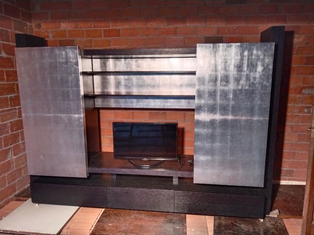 Mueble de madera en color negro, estilo moderno para salón con mesa a juego. Está montado provisional para poder verlo.Mejor en la realidad que en las fotos.