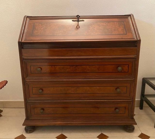 Detalles del productoMueble tipo escritorio / secreter de madera, tipo vintage / antiguo. El mueble cuenta con 3 cajones grandes y una puerta abatible que se puede cerrar con llave.