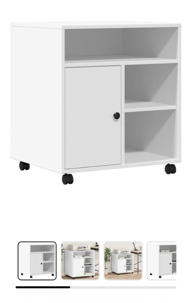 Mueble auxiliar soporte para impresora, con ruedas, ideal para organizar tu espacio de trabajo o estudio. Cuenta con un compartimento cerrado y estantes abiertos.