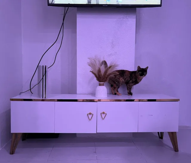 Mueble de televisión moderno con un diseño elegante. - Acabado en blanco brillante. - Detalles dorados en el borde superior y tiradores. - Patas de madera inclinadas.