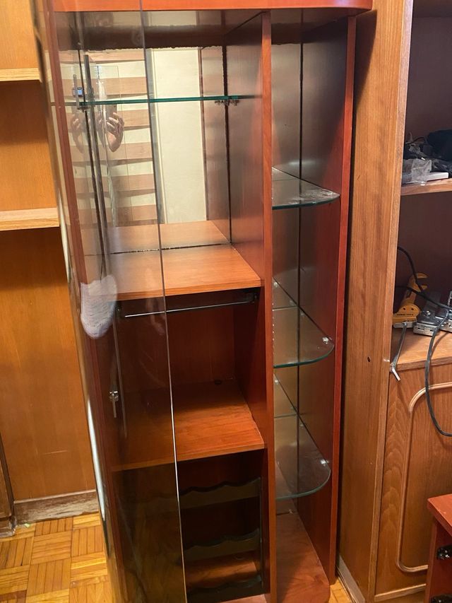 Elegante mueble vitrina con estructura de madera y puertas de cristal. El mueble tiene sus respectivos cajones. Base con compartimentos para botellas.
