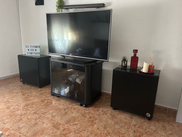 - Dos son iguales y uno es un poco más grande, con puertas de cristal y ruedas giratorias (genial para tv de gran tamaño).