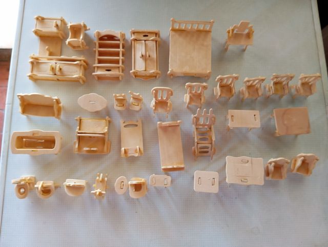 Detalles del productoConjunto de muebles de madera para casa de muñecas. Ideal para coleccionistas o para jugar. Van treinta y seis piezas