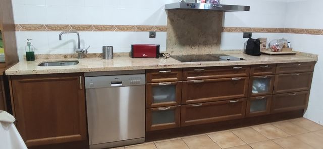 Vendo muebles de cocina 3,20 m. Roble Viejo, puertas macizas interior forrado en melamina tipo roble viejo, con cajones correderas en acero. Armario independiente despensero. Armario aparador alto y bajo. Encimera granito tipo alabastro Mueble horno-microondas Perfecto estado. Muy ecomica