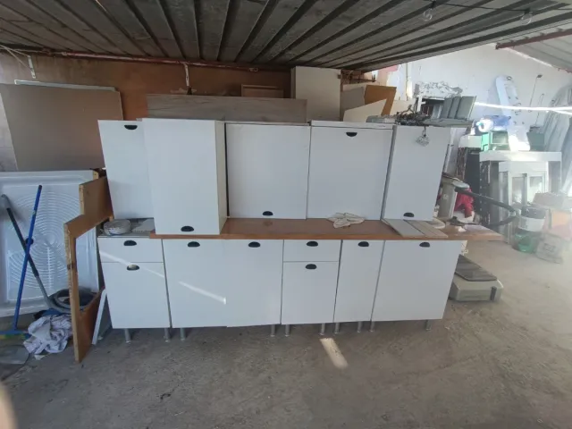 Conjunto de muebles de cocina blancos, ideales para renovar tu espacio. - Muebles bajos y altos. - Diseño moderno y funcional. - Tiradores negros.