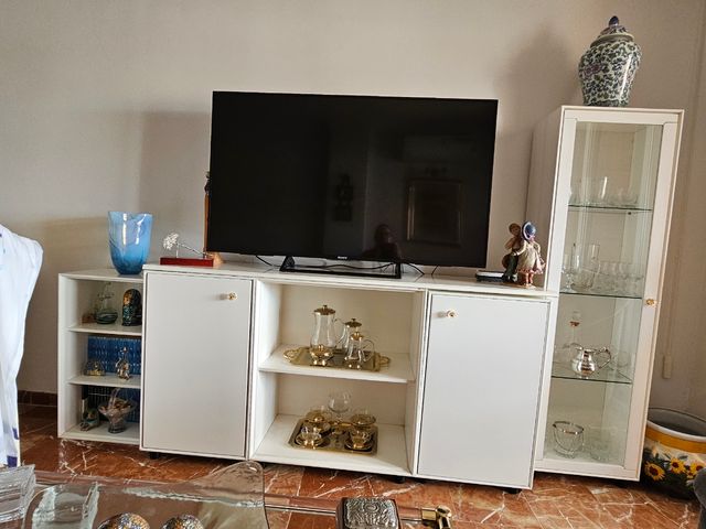 Detalles del productoSe vende muebles completos de salón incluidas seis sillas, todo lacado en blanco y de buena calidad. Todos tienen patas para regular altura.El bajo de TV, consta de 2 módulos con puertas de 0,45x0,41x0,75 y 1 módulo con 3 estantes de 0,70x0,75x0,41.