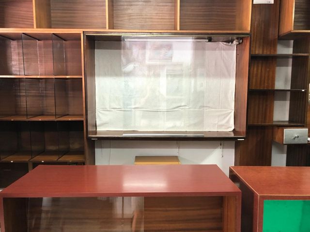 Conjunto de muebles de madera para tienda. - Estanterías de madera oscura. - Mueble expositor con cristal. - Cajón metálico. Escuchó ofertas