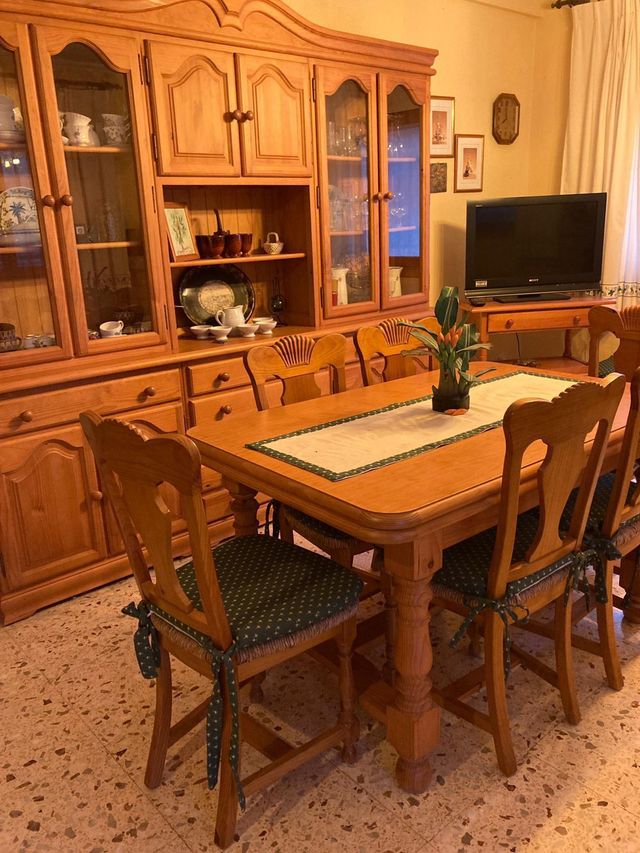 Detalles del productoPor reforma de casa de campo. Se vende todos los muebles del comedor. Aparador, Mesa extensible, 6 Sillas, Mueble de Tv, Sofa 2 plazas + 2 sofas individuales (no se ven en las fotos), mesita baja. En perfecto estado, para amueblar todo el comedor. Mueble de pino. Precio de oportunidad 300€. Solo hasta el viernes 26. Despues ya no estarán disponibles.