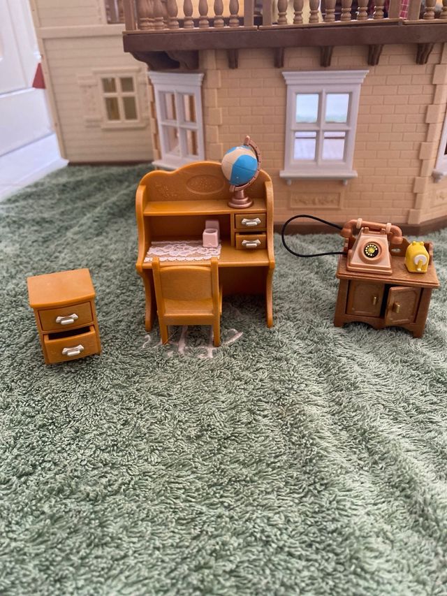 Detalles del productoConjunto de muebles Sylvanian Families para casa de muñecas. Ideal para decorar una habitación infantil. Incluye un escritorio con silla, una pequeña cómoda y una mesita de noche. Todos los muebles son de color marrón claro y están en buen estado. - Escritorio con cajón y espacio para accesorios. - Silla a juego con el escritorio. - Cómoda de dos cajones. - Mesita de noche con dos cajones.